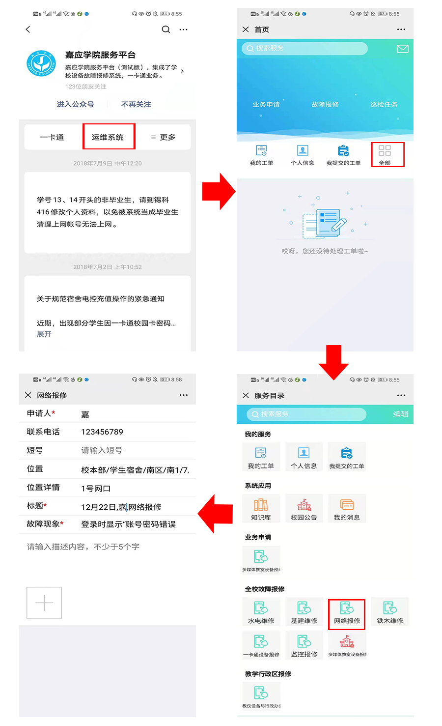 01网络故障申报公众号报修 假如出现网络无法使用的情况,请不要紧张,看看同宿舍、隔壁宿舍的同学能不能上网,然后试试重启电脑。 如果还是不能上网的话,请关注一下公众号嘉应学院服务平台,点击“运维系统”里的“全部”,选择“网络报修”并填报工单,我们这边会有网小管跟进的! 网上报修 网..