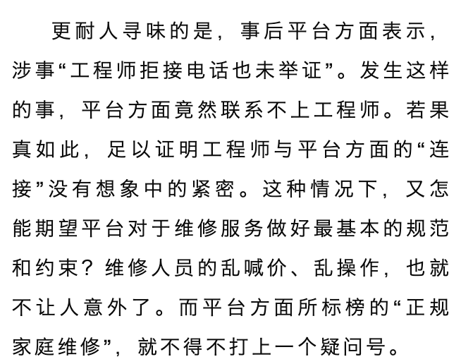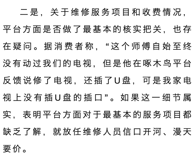 分论点:阐述网络维修平台的风险——2、关于维修服务项目和收费情况,平台方面是否做了最基本的核实把关,也存在疑问。