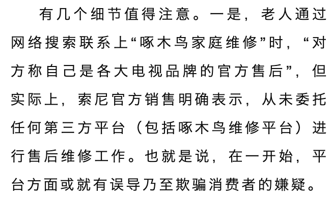 分论点:阐述网络维修平台的风险——1、有些品牌从未委托任何第三方平台(包括啄木鸟维修平台)进行售后维修工作,平台方面或就有误导乃至欺骗消费者的嫌疑。