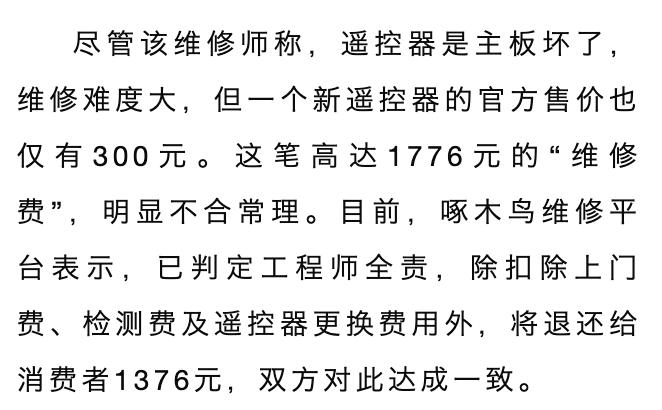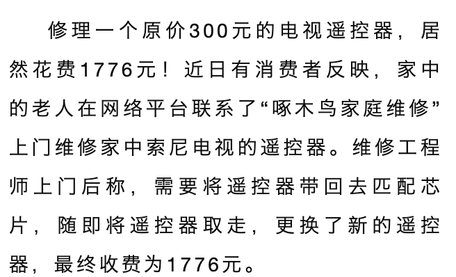 开头交代文章背景:修理一个原价300元的电视遥控器,居然花费1776元。