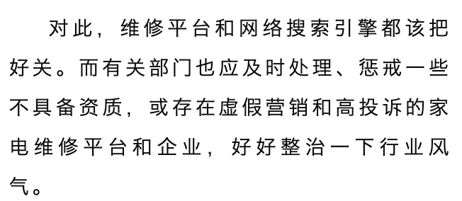 结尾:阐述对策建议——1、维修平台和网络搜索引擎都该把好关;2、有关部门也应及时处理、惩戒一些不具备资质,或存在虚假营销和高投诉的家电维修平台和企业,整治行业风气。